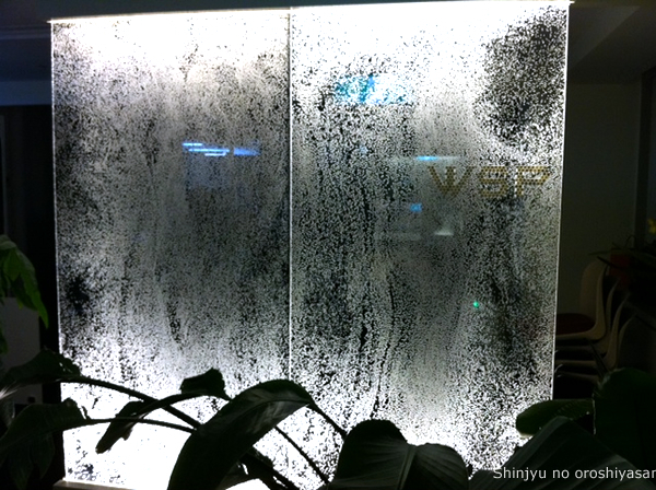 弊社事務所、入口 のLED照明で光っている壁。