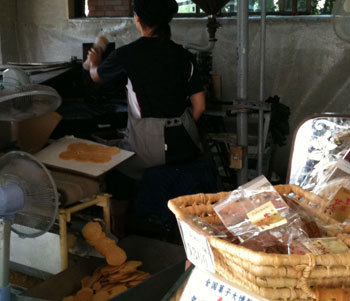 (宝塚温泉の炭酸せんべいを焼いている風景)