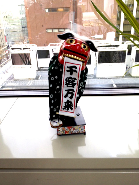 2011年12月28日 今年も残すところあと少し Tweet 弊社のオブジェがサンタクロースから獅子舞に変わりました。 毎年の飾り付けなのですが、このオブジェが登場するたびに年の瀬を感じます。 今年は未曾有の大震災もあり、新年が明けても、どこか心から『おめでとう』と言えない 自分がありますが、来年も少しでも周囲のお役に立てるよう、頑張りたいと思います。 昨日より今日、今日より明日と、日々少しでも進歩していけますように。 わたなべ