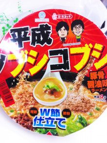 2012年6月17日 コンビニで~ Tweet らーめんが食べたくなって~ コンビニでカップラーメンを探しに~~ こんなの発見!! 平成ノブシコブシのらーめん とんこつ醤油でWカツオ仕立て 私好みの味じゃないですかぁ~~ て、事でGET~ 麺は硬麺で、スープもアッサリだけど、 しっかり出汁の味がして美味しかった ミヤモト