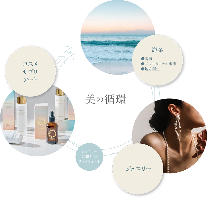 ジュエリーの基準に満たなかった真珠やその殻にも、新しい命を吹き込み、独自の技術で化粧品やサプリメント、さらにはアートへと再生させる“アップサイクル”に挑戦しています。
