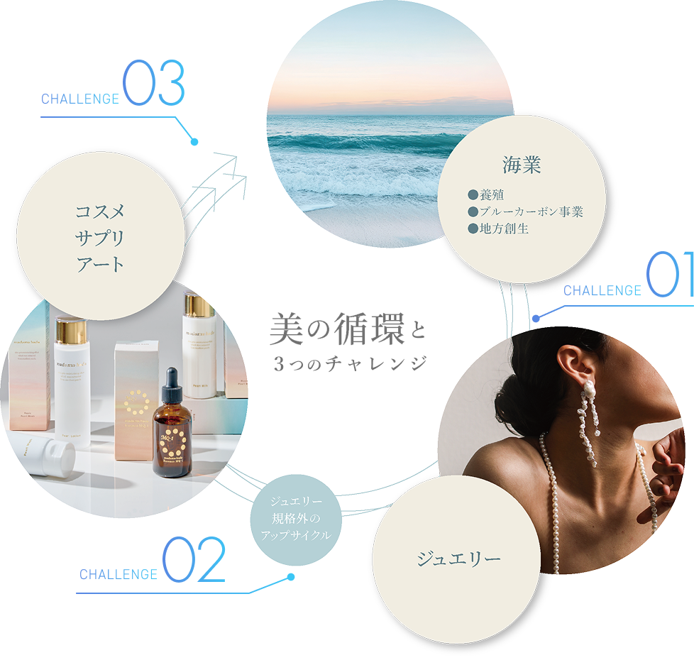 30年の歴史の中で、真珠卸から真珠ジュエリー、真珠からアップサイクルしたコスメ・サプリへと、真珠をコアアセットとした事業領域の拡張を果たし、国内外問わず幅広いお客様・お取引先様との関係を築いてきました。